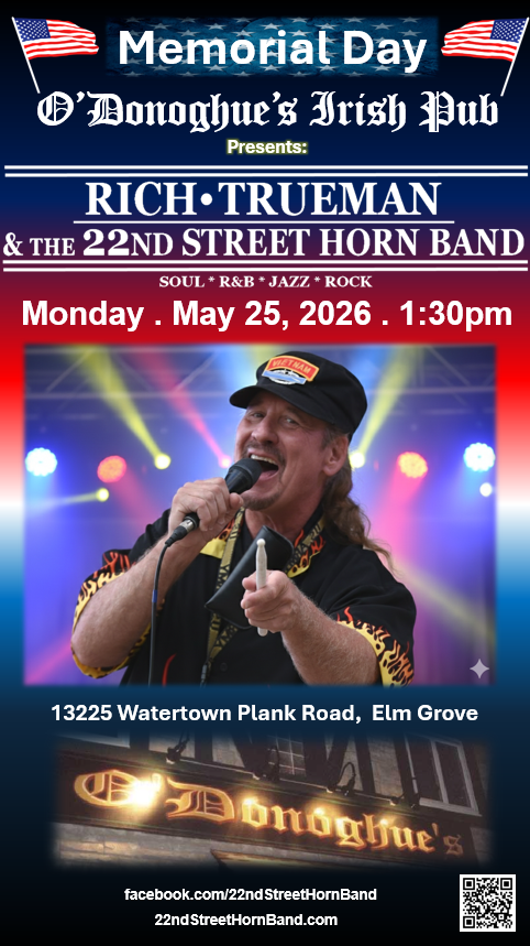 This Memorial Day, skip the backyard grill for a few hours and join Rich Trueman & the 22nd Street Horn Band for a high-energy afternoon of classic soul, rock, and rhythm & blues. We’re taking over the parking lot at O’Donaghue’s Irish Pub in Elm Grove, and you won’t want to miss it.
